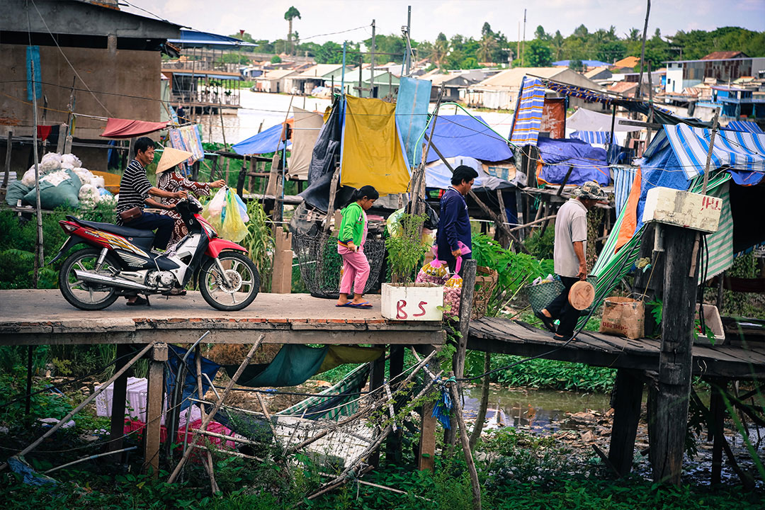 Approaching the northern Delta on the Hau River, I visit a Cham village that lies behind a curtain of mangroves and Nipa palms. Children play on a long rickety jetty, leaping into the river as a warm rain sets in. The Cham people are a Muslim minority and one of the oldest communities to settle in this area. Their homes are set on high stilts, and the ground is slippery clay. This is a town designed to ride out the annual flood season.